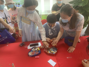 熱鬧的活動現(xiàn)場,大人們忙著包粽子、縫荷包,孩子們則流連于投壺、套圈、釣魚等各種游戲間,早忘了答應(yīng)給大人幫忙的最初想法。裕泰園還在開場前準備了端午節(jié)相關(guān)知識的有獎問答環(huán)節(jié),趣味的問題、豐富的獎品,早早的將活動氣氛推向了高潮。