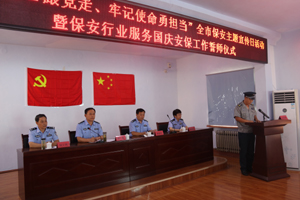 本次活動共有三項議程,一是三家保安服務(wù)公司代表上臺表態(tài)發(fā)言,二是市公安局楊德軍書記講話,第三項在場全體保安人員做安保工作誓師。