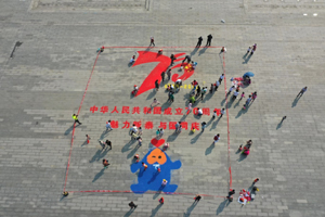 本次活動(dòng)是以傳統(tǒng)的沙畫、獨(dú)特的地畫這種藝術(shù)形式,由50名兒童親自手繪出了“中華人民共和國(guó)成立70周年”字樣、“70”圖案、新泰吉祥物,共賀新中國(guó)成立70周年。 (白文波)