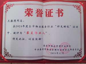 12月17日,在泰安市物業行業管理協會第三屆第二次會員代表大會上,華通物業獲得泰安物協頒發的2024年度“優秀會員企業”、“優秀物業項目”榮譽,公司經理徐海榮獲“優秀物業服務經理人”,安建、王振濤分別獲得“最美物業人”稱號。(劉劍)