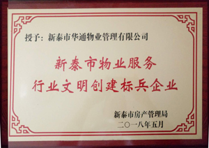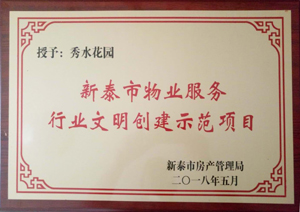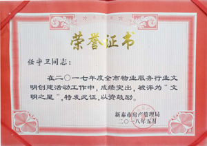 在2017年度全市物業(yè)服務(wù)行業(yè)文明創(chuàng)建活動工作中,新泰市華通物業(yè)管理有限公司榮獲新泰市物業(yè)服務(wù)行業(yè)文明創(chuàng)建標(biāo)兵企業(yè),秀水花園小區(qū)榮獲新泰市物業(yè)服務(wù)行業(yè)文明創(chuàng)建示范項(xiàng)目,秀水花園小區(qū)項(xiàng)目經(jīng)理任守衛(wèi)同志榮獲“文明之星”稱號。