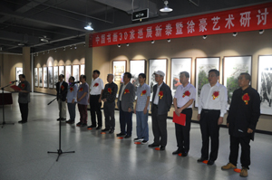 9月19日,新泰文化藝術城隆重舉辦“中國書畫30家巡展新泰暨徐豪藝術研討會”開幕儀式。本次活動是由泰安市美術家協(xié)會、中共新泰市委宣傳部、新泰市文廣新局、新泰市文聯(lián)主辦,新泰市美術家協(xié)會、山東澤華置業(yè)集團有限公司、新泰市西張莊建筑安裝工程公司、農工黨安徽省書畫院、農工黨蚌埠市書畫院、北京藝報國際文化傳媒有限公司承辦,中國藝術報道編輯部、藝術視野編輯部、青州美術編輯部、北京紅森尚藝畫院、江蘇宜興杭中吉藝術館、農工黨山東省書畫院協(xié)辦。山西省文聯(lián)主席、山西省書協(xié)、美協(xié)名譽主席張根虎同志;農工黨安徽省委員會副廳級調研員李松奇同志;四川省美協(xié)副主席賀丹晨同志;云南省美協(xié)副主席孫建東同志;黑龍江省美協(xié)副主席荊桂秋同志;中共新泰市委宣傳部常務副部長范清君同志;泰安市美術家協(xié)會副主席、新泰市書協(xié)、美協(xié)主席陳廣秀同志;山東澤華置業(yè)集團有限公司副總經(jīng)理王成喜同志;中國書畫30家巡展策展人劉振虎同志;畫家代表、安徽財經(jīng)大學教授徐豪同志;新泰市西張莊建筑安裝工程公司公衍軍同志出席了開幕式。新泰市文聯(lián)主席徐勤啟同志主持了開幕儀式。