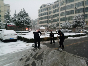 由于雪一直不停地下,剛剛掃過的路面又被覆蓋,大家只能反復清掃,沒有怠慢和埋怨。現場掃雪工作人員的手和臉都凍得通紅,然而這一切絲毫沒有影響保障業主安全的真心與熱情,大家發揚吃苦耐勞、頑強拼搏的戰斗精神,頂著寒風,揮舞著鐵鍬和笤帚,相互配合,你鏟我掃,一點點地將積雪和冰層鏟起集中堆放,將積雪清掃干凈。